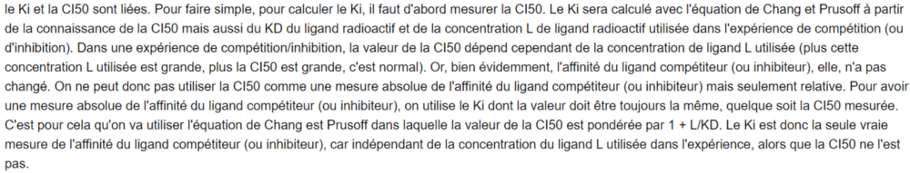 Ancien Responsable Matière Téo Posted April 26, 2020 Author Ancien Responsable Matière Posted April 26, 2020 @Nymma Alors effectivement la CI50 est par rapport à un inhibiteur. Mais cela peut te donner une idée une "estimation" de l'affinité du ligand agoniste vu que l'inhibiteur et l'agoniste sont en compétition donc tu peux voir lequel a la meilleure affinité. Après je suis d'accord que j'aime pas beaucoup cet item... Le Ki c'est comme le Kd mais pour l'inhibiteur cela représente son affinité ! Plus le Ki est faible plus l'affinité de l'inhibiteur pour la cible est forte ! Dis moi si jamais tu coince toujours Quote