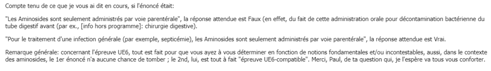 Ancien Responsable Matière Téo Posted May 1, 2020 Author Ancien Responsable Matière Posted May 1, 2020 @Marinaddt Alors j'aimerais bien savoir où tu as eu cette information. Je n'en ai jamais entendu parler et après des recherches les aminosides sont utilisés pour traiter des infections rénales et urinaires pas digestives. Je ne suis donc pas sur qu'ils soient employés localement et même si c'était le cas je le classerais comme hors programme car pas évoqué dans le cours. Rappel de ce que dit le cours : les aminosides sont trop hydrophyles pour passer par voie passive au travers des entérocytes et n'ont pas de transporteur pour passer par voie active. Fais moi signe si jamais tu es sure de ton info Quote