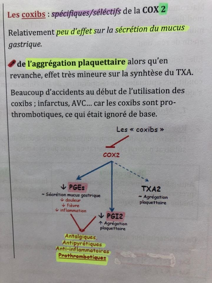 Solution Aylou Posted April 17, 2020 Solution Posted April 17, 2020 Alors : la COX 1 (constitutive ; physiologique et permanente) a en effet d'autres rôles, mais surtout de fabriquer du mucus pour protéger l'estomac ! En fait la COX appartient à une grosse enzyme formée de COX + péroxydase qui en effet dégrade l'ac arachidonique en PgH2 qui à son tour est transformé. J'avoue que c'est flou Senard aime bien quand on comprend pas trop je crois, mais retient les deux choses que je t'ai dite ! L'ibuprofène n'est pas sélectif en effet, je ne vois pas la diapo alors je ne sais pas mais c'est sur qu'il n'est pas sélectif ! Alors les coxibs : est-ce que tu comprends avec cette photo ou il te faut plus d'explications ? Dis-moi ! Quote