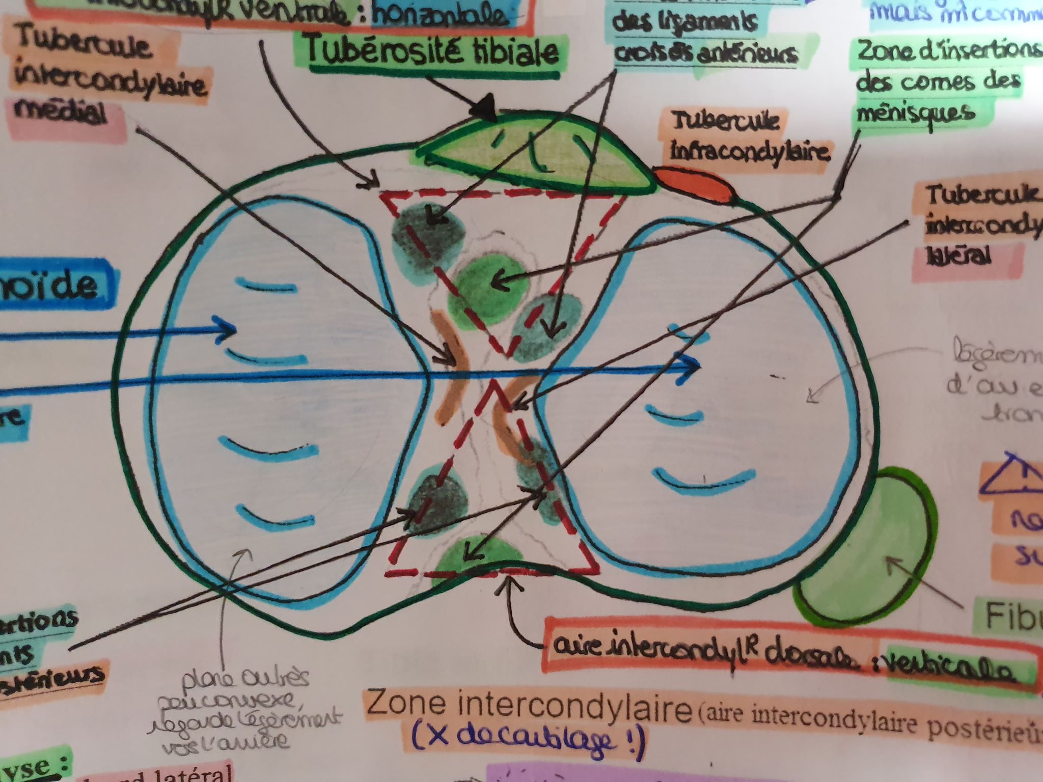Ancien du Bureau Petit_Bateau Posted April 18, 2020 Ancien du Bureau Posted April 18, 2020 il y a 11 minutes, Aligot a dit : je viens aider mon camarade @Petit_Bateau qui est clairement parti au front avec toutes tes questions il y a 11 minutes, Aligot a dit : Les ligaments croisés du genou se fixent au niveau ton plateau tibial, plus précisément au niveau des ronds bleus clairs que tu vois sur mon schéma (désolée pour toutes les couleurs). Attention, tes ligaments croisés ne se fixent pas au niveau de tes tubercules intercondylaires (médial et latéral) comme tu peux le voir Juste 2 secondes, c'est toi qui a fait ça ? mais clairement remplace moi pour les schémas il faut que tu interviennes tout le temps, c'est magnifique !!!! Et d'ailleurs petite question @Aligot est-ce qu'on connait les insertions de ce ligament au niveau de l'épiphyse distale du fémur ? Je dirais au niveau de la fosse intercondylaire mais j'ai rien noté sur ça donc je ne sais pas trop ... une idée ? il y a 14 minutes, Aligot a dit : Bonne soirée à vous ! c'était bien Koh-Lanta hier ? Bonne soirée matelots ! Quote