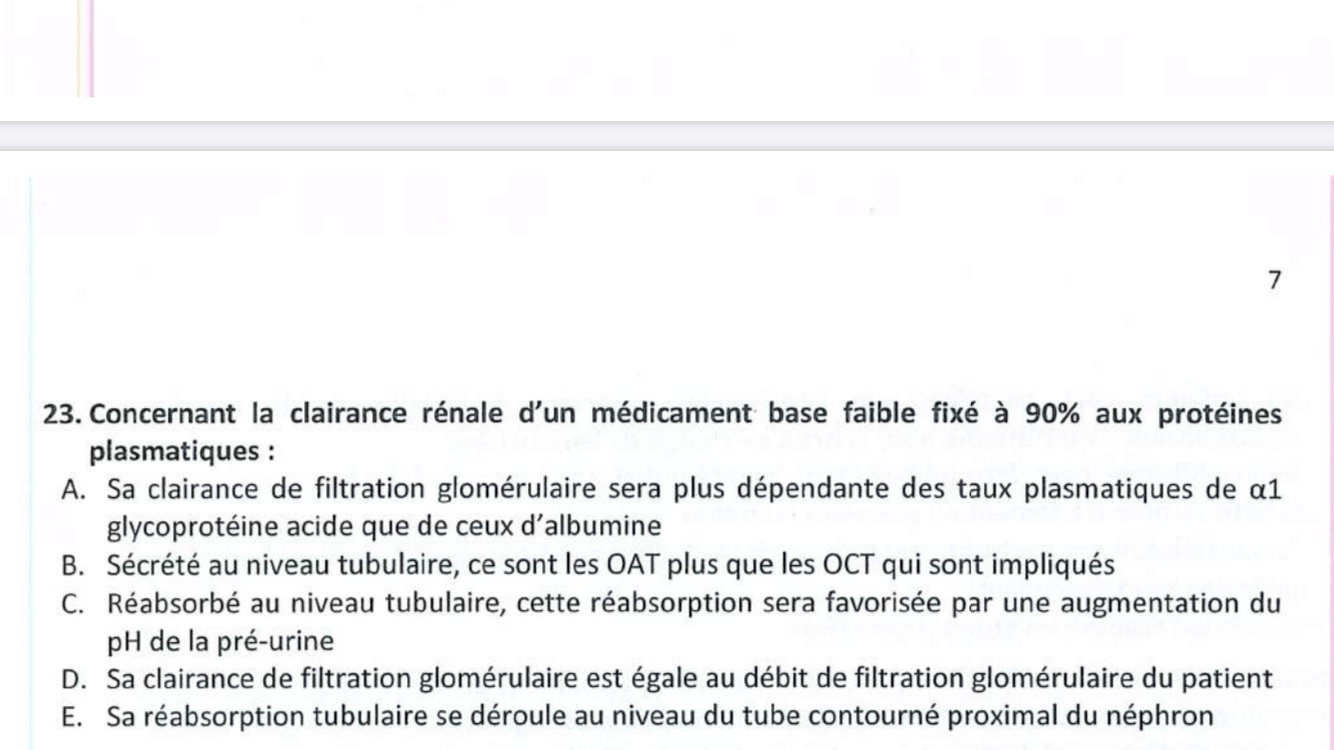 Ancien Responsable Matière Solution PierrickSenior Posted April 20, 2020 Ancien Responsable Matière Solution Posted April 20, 2020 Bonjour @Zoup04, Il faut avoir en tête que d'après l'énoncé le médicament étudié est une base faible. La principale caractéristique d'une base faible, ici, est d'être sous forme BH+/B en fonction du pH. A savoir que cette base faible aura un pka bien précis. Si le pH de la pré-urine est inférieur au pka alors on sera dans un pH acide pour cette base faible, elle sera sous forme BH+ donc sous forme ionisée, maintenant si on augmente le pH de la pré-urine jusqu'à ce quel soit supérieur au pka de la base faible alors celle ci sera sous forme B, donc non ionisée. Maintenant règle des plus importante : Molécule sous forme ionisée -> Hydrophile Molécule sous forme non ionisée -> Lipophile. Au vue du raisonnent précédent, la base faible passera sous forme non ionisée si on augmente le pH. Donc si sous forme non ionisée la molécule devient aussi plus lipophile. En se basant sur nos notions fondamentales, on sait qu'une molécule lipophile est une molécule qui va facilement diffuser à travers la membrane. Donc la réabsorption tubulaire sera ici, favorisée par une augmentation de pH. Bien à toi, Quote