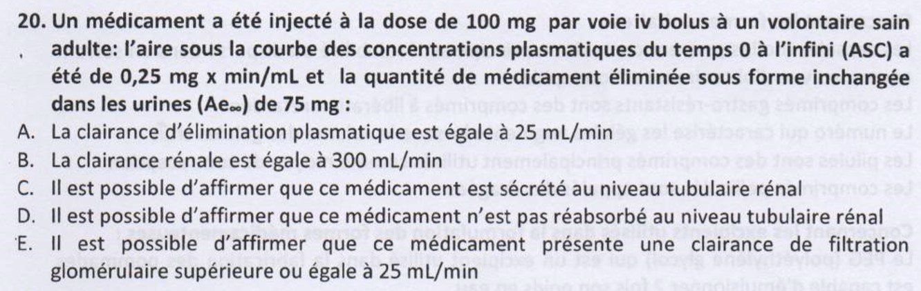 Ancien Responsable Matière Solution ISB Posted April 29, 2020 Ancien Responsable Matière Solution Posted April 29, 2020 Salut @juliettef, @VESPA (welcome back) et @Aligot, Pour l'item E sachez qu'il est faux, vous pouvez le vérifier sur la grille de correction officielle disponible sur moodle dans l'espace UE6. Sans le fu on ne peut pas compter vrai cette affirmation En bonus je vous mets une réponse moodle de Chatelut sur ce QCM : Les valeurs de l'énoncé permettent de calculer la clairance rénale (75/100 de 100mg/0,25mg.min/mL soit 300 mL/min Ce médicament est à coup sûr sécrété au niveau tubulaire rénal car sa clairance rénale est supérieure au débit de filtration glomérulaire (120 mL/min) qui représente la valeur maximale que peut être la clairance de filtration glomérulaire d'un médicament. En revanche, on ne peut pas affirmer qu'il n'est pas réabsorbé ; et sa clairance de filtration glomérulaire est peut-être inférieure à 25 mL/min ; donc D et E sont Faux. Exemple: un médicament fixé à 90%: CL FG = 12 mL/min, ayant une CL réabsorption tubulaire de 32 mL/min et une CL sécrétion tubulaire de 320 mL/min. Bon courage ! Quote