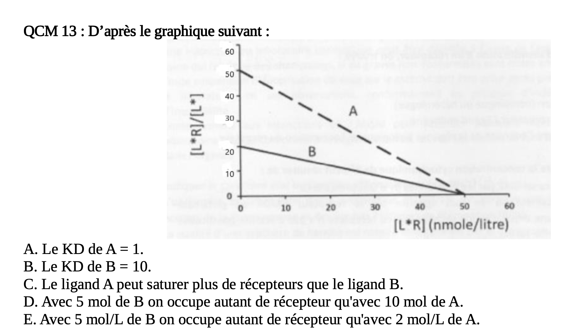Solution Jujugulaire Posted May 1, 2020 Solution Posted May 1, 2020 Salut @uap_brt, je suis d'accord avec toi, séparément et à saturation au final ils ont le même Bmax donc ils peuvent saturer le même nombre de récepteurs même si B nécessitera une plus grande quantité pour y arriver. Mais peut être que là ils voulaient dire que si on mets les 2 ligands ensembles (même quantité), comme A a une plus grande affinité, il occupera plus de récepteurs que B lorsque ils seront tous saturés ? Je sais pas vraiment si mon raisonnement est valable ... Après j'aurais mis faux moi aussi parce que je le comprends comme toi, à voir avec un tuteur ... Quote