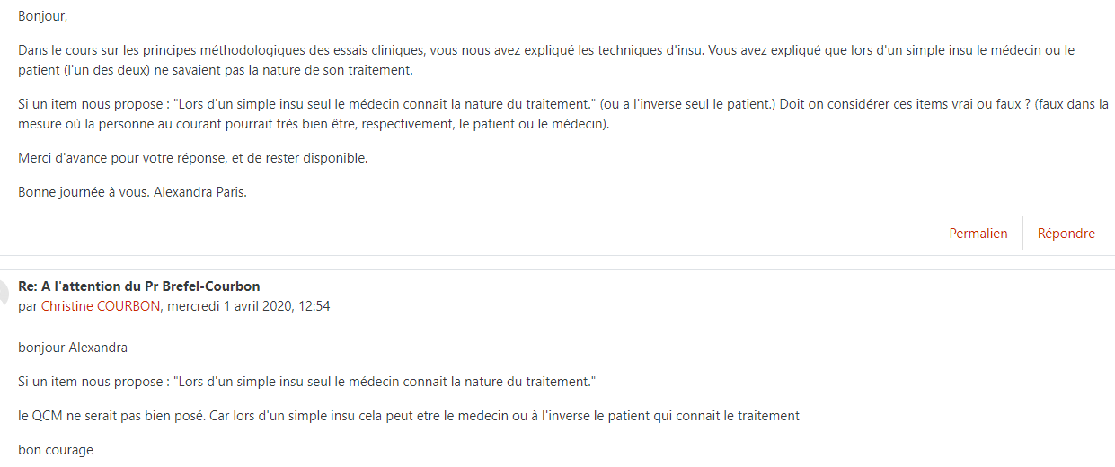 Ancien Responsable Matière Solution choLOLApine Posted May 2, 2020 Ancien Responsable Matière Solution Posted May 2, 2020 Saluut! Pour ta première question ça a été expliqué ici: 2) Il me semble que j'ai déjà fait ces QCM, l'item c'était plutôt "une administration quotidienne correspond à un cumul de dose" non? Dans ce cas là c'est vrai, puisque la 1/2 vie est de 40h, si t'en prends un tous les jours, celui de la veille n'aura pas encore été éliminé donc tu cumules les doses. Si je me trompe sur l'item et que la question était bien de déterminer nous même qu'un cumul de dose serait plus adapté alors je sais pas trop non plus, faudrait demander à un tuteur 3) En effet, le Pr. Courbon a bien dit qu'en cas de simple insu c'était soit le médecin soit le patient qui connaissait le traitement et elle l'a confirmé récemment sur moodle 4) Pour la B, je dirai faux pour moi pour rester dans l'index thérapeutique il faut maintenir une concentration autour de la Cmoy, or ton médicament a une demi vie de 2h donc au bout de 24h il aura été largement éliminé et la concentration ne sera plus du tout dans l'index thérapeutique Pour la D, c'est vrai la Cmoy est atteinte en 5 demi vies, donc 10h ici Pour la E, je dirai vrai : t'as injecté 200mg, au bout de 2h (ta demi vie) il te reste la moitié donc 100mg dont 90% est métabolisé -> 90mg En espérant t'avoir aidé sans dire de betises Quote