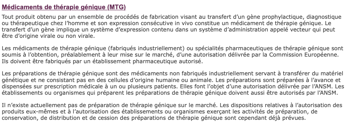 Solution Chat_du_Cheshire Posted May 9, 2020 Solution Posted May 9, 2020 Voilà le message de JmS qui a mis tlm d'accord durant ma paces @Lemillion "Certians médicaments "sensibles" dont les les médiaments de biotechnologie dont font partie les MTG sont évalués au niveau "central" par l'EMA et la décision finale de mise sur le marché est la prérogative de la Commission Européenne. Les préparations de thérapie génique ne sont pas des médicaments puisque'ils n'ont pas d'AMM. ce sont des produits en cours d'évaluation en clinique et ils ont un contrôle de qualité et de sécurité qui est fait par l'ANSM" Quote