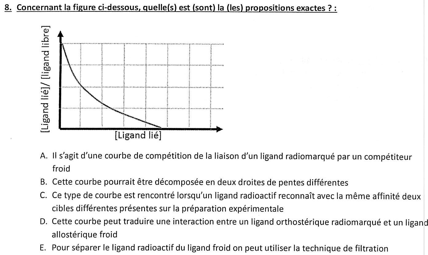 anaisclnt Posted May 12, 2020 Posted May 12, 2020 Coucou Item A: Il s'agit d'une courbe de saturation de liaison à l'équilibre Item B: c'est vrai, dans le cas où après linéarisation on n'obtient pas une droite mais une courbe comme celle-ci, on peut la décomposer en deux droites, ce qui signifie que l'on a deux sites de liaison pour un récepteur Item C: Du coup c'est faux, elle aura une affinité différente puisqu'on a a deux Kd différents Item D: Vrai, on rappelle qu'un orthostérique se fixe sur le même site que le ligand endogène et le ligand allostérique se fixe sur un site différent Quote