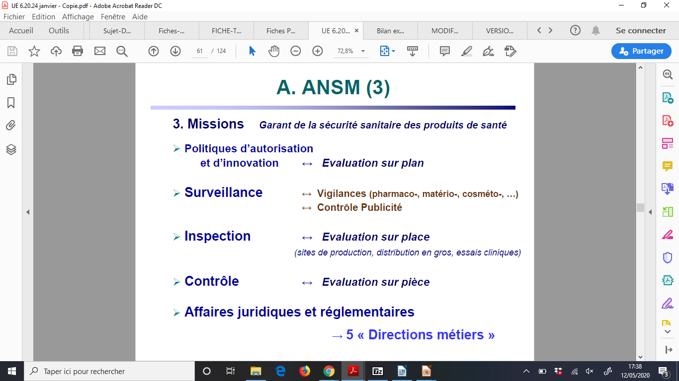 Ancien Responsable Matière LAmi_Omelette Posted May 12, 2020 Ancien Responsable Matière Posted May 12, 2020 (edited) Salut ! Pour le concours blanc que vous avez fait (merci beaucoup !) j'ai une question : 18-C : "L'évaluation sur pièce correspond à la mission « surveillance » de l'ANSM." est compté fausse (je suis d'accord) mais la correction donne "L'évaluation sur pièce est la mission "contrôle" de l'ANSM, la mission « surveillance » est consacrée à la pharmaco, matério, cosmétovigilance ainsi qu'à la publicité." Je suis d'accord avec la fin mais pas le début.. On a pas plutôt une évaluation sur plan, inspection sur place et contrôle sur pièce ? Merci !! Edited May 12, 2020 by LAmi_Omelette Quote