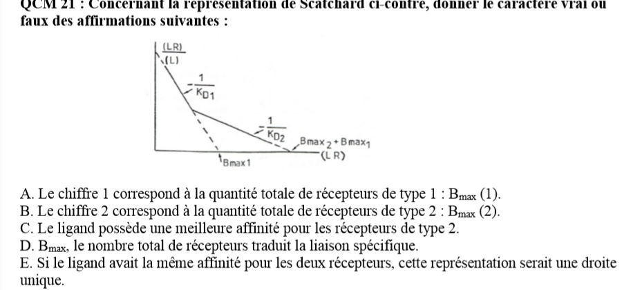 Solution Constant Posted May 26, 2020 Solution Posted May 26, 2020 Salut @miss_tinguette, -Le Bmax correspond à la quantité totale de récepteurs pour un ligand spécifique ([R]+[LR]). Il s'agit donc de la liaison spécifique qui est saturable. La liaison non spécifique est insaturable et le regroupement des deux forme la liaison totale. -Pour le QCM 13, la question est mal posée je pense. Les Bmax de A et B sont identiques mais le KD de A est différent de celui de B : KD(A) < KD(B) donc Affinité(A) > Affinité(B). Pas de différence dans le nombre de récepteurs mais on remarque seulement que A aura plus d'aisance à se fixer que B. En espérant t'avoir aidé, bonne journée. Quote