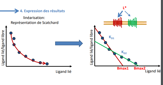 Solution Chat_du_Cheshire Posted June 3, 2020 Solution Posted June 3, 2020 toujours là tqt @Trijumeau : Le 31/05/2020 à 22:38, Trijumeau a dit : -pour les recept à activité tyr k il y a un truc que j'ai pas saisit => il y dimerisation pour effectuer l'auto' phosphorylation(ou oligomérisation pour être + general) mais est-ce que pour que les recepteurs s'associent le ligand doit se fixer sur les 2 récepteurs ou 1 seul suffit et celui-ci recrutera l'autre pour la dimerisation? non un seul ligand suffit, la dimérisation rapproche les récepteurs mais de base ils ne sont pas loins, c'est la liaison du ligand qui rapproche et dimérise Le 31/05/2020 à 22:38, Trijumeau a dit : pour la courbe ci-dessous en ayant un contexte classique en qcm sans informations particulieres j'ai cru comprendre qu'il y a possibilités pour interpréter la courbe on a soit : -un ligand ortho froid et allost chaud (ce qui était compté vrai dans le qcm) -OU un ligand chaud qui se fixe sur 2 recepteurs d'affinité differentes (en passant j'ai un pb avec la notion de linearisation => est-ce que, malgré que ça ne dessine pas une droite on considéré la linéarisation de la courbe et on la nomme diagramme de scatchard ? je fais ref à cette diapo je sais que c'est ecrit mais j'ai peur de mal interpreter) - (voici la courbe sur laquelle je me questionne) Alooors reprenons : comme tu le sais la représentation de Scatchard c'est linéaire, on a une seule droite simple. Maiiis parfois on n'obtient pas une droite, on parle de Scatchard curvilinéaire (courbe), qu'on peut donc modéliser par 2 droites cette fois-ci (et pas une seule comme dessus) et il y a 2 explications à cela : 1) le ligand radioactif n'est pas spécifique d'une seule cible (il y a donc 2 affinités différentes) 2) le ligand froid se comporte comme un ligand ALLOstérique, il y a donc coopération négative entre ce ligand ALLOstérique FROID et l'autre ligand ORTHOstérique CHAUD Voilààà dis-moi ce que tu en penses Quote