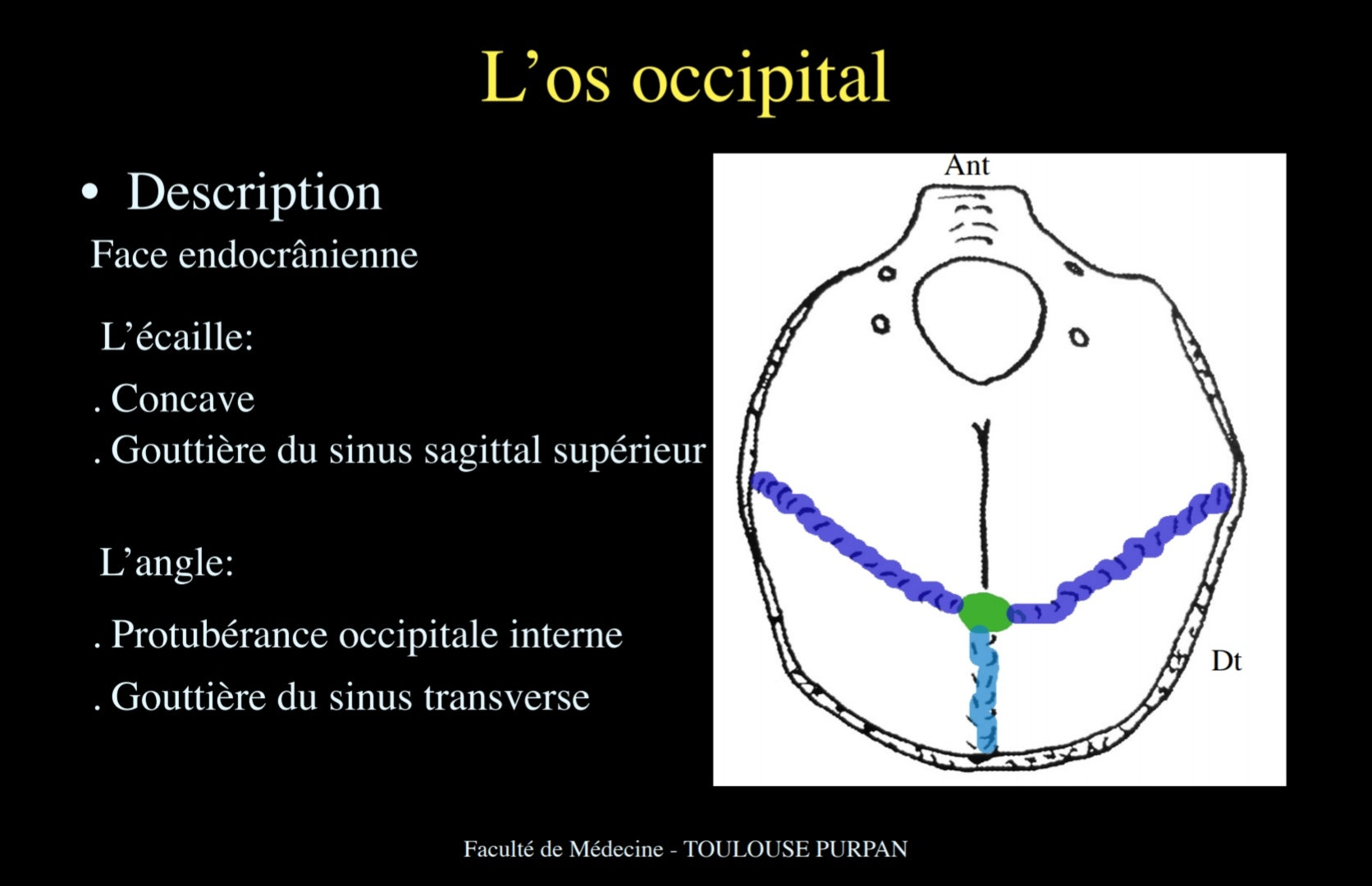 Ancien Responsable Matière Solution Tacocat Posted June 2, 2020 Ancien Responsable Matière Solution Posted June 2, 2020 Hallo meine Liebste @DrR 3B : le sillon du sinus transverse débute au niveau de la protubérance occipitale, il fait suite au sillon du sinus sagittal supérieur et se prolonge par le sillon du sinus sigmoïde (puis les sinus sigmoïdes se drainent dans les veines jugulaire interne puis ça redescend vers le cœur, cf. ce que je t'avais dit sur un des posts en anat : les veines c'est de la périphérie vers le cœur donc le sinus transverse débute bien à ce niveau là) 3D : le sillon du sinus sagittal supérieur se termine au niveau de la protubérance occipitale (encore elle) 3E : pour moi les impressions digitées correspondent aux reliefs formés par la base du crâne (et son système de croissance) en réponse aux gyrus des structures nerveuses, or le Sillon du sinus transverse limite en arrière l'étage postérieur de la base du crâne, donc en arrière du sinus il n'y aura pas ces impressions digitées, mais en avant je dirais que oui (mais peut-être que le prof ne parle d'impressions digitées que pour l'os frontal ce qui ne changerait pas la correction) Je te met ce schéma qui t'aidera à mieux comprendre ces 3 items 4A : alors le I traverse seul la lame criblée de l'ethmoïde, le II traverse seul le canal optique, le XII traverse seul le canal de l'hypoglosse et le V je ne saurais pas trop comment le compter car le V1 traverse la fissure orbitaire supérieure avec le III, le IV et le VI mais le V2 et le V3 traversent la base du crâne indépendamment, dans tous les cas ce n'est pas 8 4B : oui c'est ça Est-ce que c'est mieux ? Quote