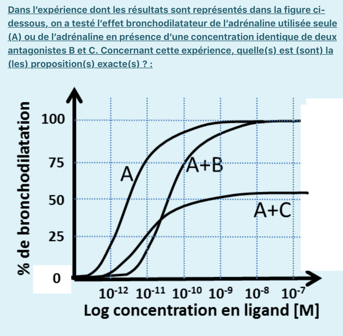 maestro Posted June 3, 2020 Posted June 3, 2020 salut @Lucille_mrn, je pense que oui, C pourrait être un antagoniste allostérique ( =NAM), il y a 10 minutes, Lucille_mrn a dit : Donc en d'autres termes est-ce que l'item suivant aurait été compté vrai : "L’expérience démontre que l’antagoniste C se lie de façon covalente au récepteur béta-adrénergique de l’adrénaline" Pour moi cela serait faux, pour les raisons que t'évoques au dessus, par contre ce qui me gêne avec cette courbe, je comprends pas pourquoi la co-administration de A et C donne une courbe avec une CE50 =/= de celle avec l'administration de A seule ptdr, quelqu'un aurait une idée? ( @lexx31 @Lemillion peut-être?) Quote