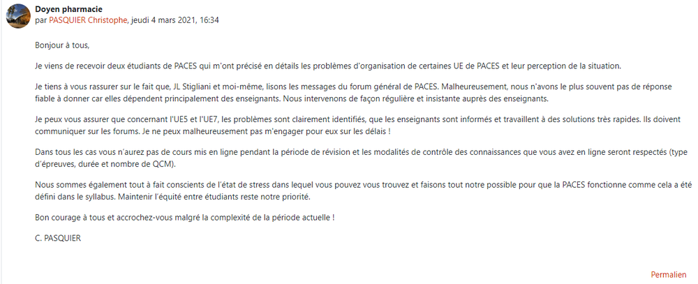 Ancien du Bureau Please Posted October 20, 2020 Ancien du Bureau Posted October 20, 2020 Alors tout le monde se calme s'il vous plait ! Ce post est réservé aux doublants et triplants de la PACES 2020/2021. Le polluer en floodant ne servira à rien, le cas est déjà arrivé l'année dernière et le post a du être supprimé. Je vous prie de garder votre calme et de ne pas créer de la haine sur le forum. Par ailleurs, en aucun cas les PACES ne sont responsables du nombre de places qui leur sont attribuées, s'acharner sur leur prétendue faute ne servira à rien. Vouloir mobiliser les instances universitaires est un droit, accuser des gens injustement ne l'est pas. Bonne soirée à tous, en espérant que vous vous contiendrez davantage. Edit : tout post incitant à la discorde sera masqué, je ne veux pas faire la dictatrice mais comprenez bien que ce genre de comportement n'est ni acceptable sur le forum, ni gérable pour nous qui tentons de vous apporter les informations les plus claires possible. Quote