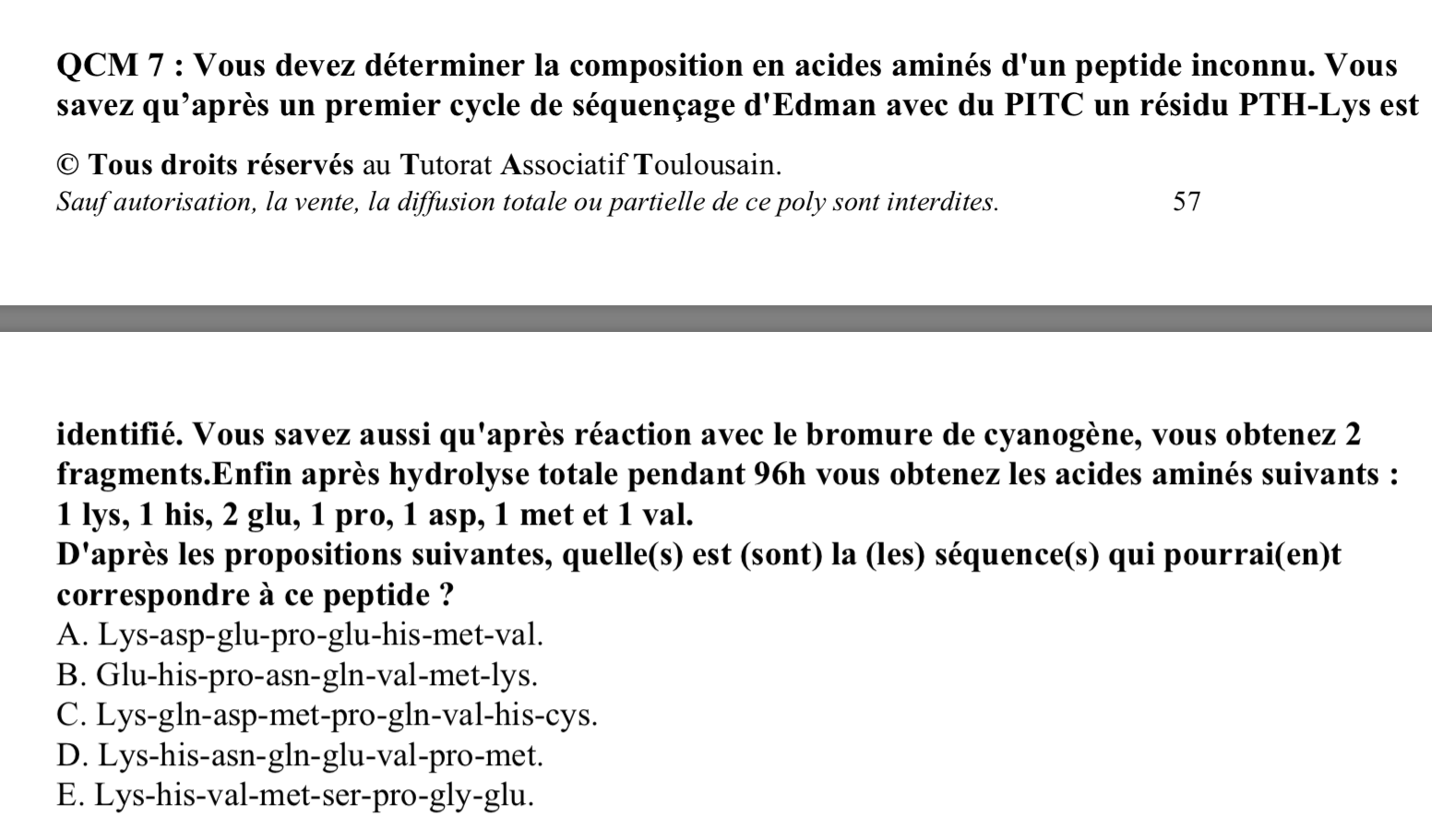 zlt136 Posted September 12, 2020 Posted September 12, 2020 (edited) Salut ! J'ai un problème avec ce QCM : En fait, c'est surtout par rapport à l'hydrolyse totale, j'ai compris que la Gln était transformée en Glu et l'Asn en Asp, mais du coup pour ce QCM, on ne devrait pas avoir 2 Gln et 1 Asn sur le peptide de départ ? Merci (les réponses vraies sont A et C) Edited September 12, 2020 by zlt136 Quote