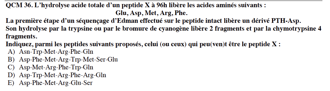 Solution Natachatte Posted September 18, 2020 Solution Posted September 18, 2020 en gros t'a ton peptide par ex: Asp-Gly-Trp ... Si tu fais un séquençage d'Edman tu vas coupler ton AA le plus NH2term , bref de le premier a gauche puis tu couple le peptide avec la PITC qui vas réagir et cliver l AA le plus Nterm, puis t'auras comme produit un PTH Asp puis le reste de ton peptide; le PTH Asp c l'Asp+la PITC =PTH Asp j'espere que tu comprends mieux et les réponses du QCM c est C et D non ? Quote