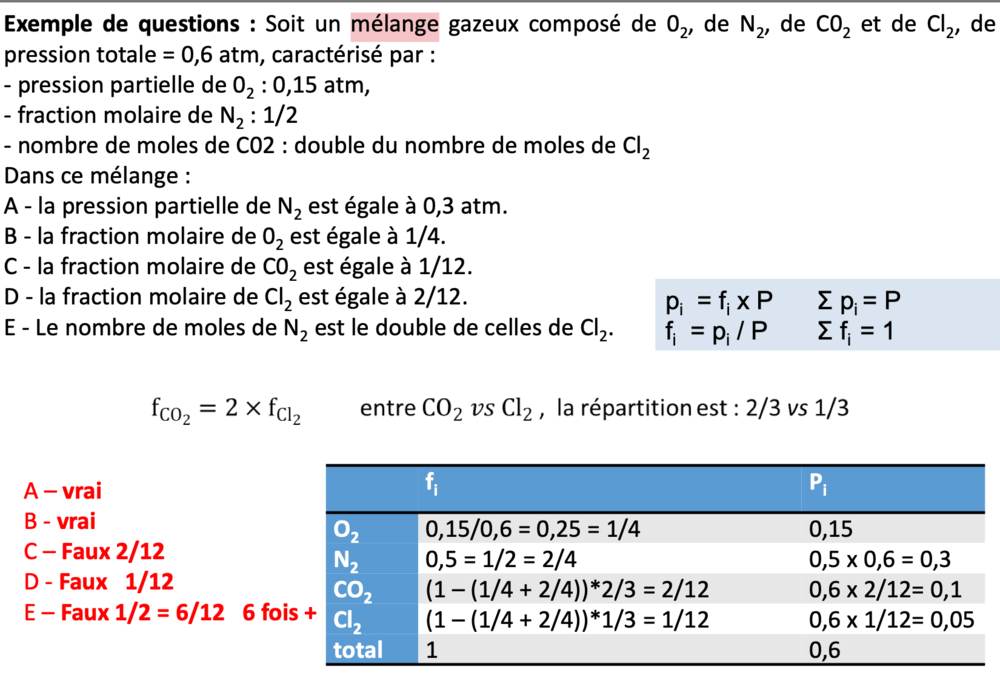Ancien Responsable Matière Solution Tardhar Posted September 20, 2020 Ancien Responsable Matière Solution Posted September 20, 2020 Salut ! je vais essayer de faire le plus clairement possible : la somme des pressions de tous tes gaz est égale à 0,6 atm - Sachant que l'O2 représente 0,15 atm, c'est 1/4 de la pression (et donc 1/4 des gaz présents) - N2 représente la moitié des gaz présent, et donc 0,3 atm 0,6 - 0,15 - 0,3 = 0,15, il reste 0,15 atm dû au CO2 et au Cl2 - or le nombre de moles de CO2 c'est le double de celles de Cl2, donc la pression aussi - Donc sur les 0,5 atm restant, 2/3 c'est le CO2 et 1/3 le Cl2 --> On a 0,10 atm de CO2 (soit 2/12) --> On a 0,05 atm de Cl2 (soit 1/12) J'espère que c'est clair si t'as d'autres questions hésite pas Quote
