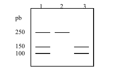 QCM 17: Chez les sujets sains, l’exon 4 d’un gène contient 250pb (il n’y a pas de site pour l’endonucléase HindIII). Cet exon peut être spécifiquement amplifié par la PCR en utilisant un couple d’amorces s’hybridant au niveau des extrémités de cet exon. Une mutation ponctuelle dans cet exon introduit un site pour l’enzyme HindIII. Une électrophorèse est réalisée après PCR de cette région génique sur l’ADN de plusieurs sujets puis incubation avec HindIII (dans des conditions de digestion complète). Après coloration au bromure d’éthidium, on obtient l’image suivante :