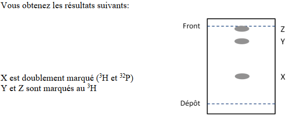 Stabilo_Boss Posted October 11, 2020 Posted October 11, 2020 Salut @Ultra-Viollet! Alors, sur une plaque de chromatographie en CCM (chromatographie sur couche mince), les molécules les plus hydrophobes migrent vers le front tandis que les molécules les plus hydrophiles restent globalement vers le dépôt. Sur le schéma ci-dessous, tu peux voir que les AG sont les lipides les plus hydrophiles de tous. Ainsi, Y ne peut pas être de l'acide palmitique car il est proche du front. Y est relativement hydrophobe. En gros sur ce schéma tu as 3 molécules, Z qui est un TAG,Y qui est un DAG et X qui est de l'acide phosphatidique. Comment je sais que X est de l'acide phosphatidique ? Parce que si c'était un lysophospholipide (un glycérol lié à un AG en sn1/2, un des sn1/2 libre et le sn3 pris par un phosphate) il serait beaucoup plus près du dépôt car les lysophospholipides sont très hydrophiles. Est-ce plus clair ? N'hésite pas à me poser des questions en MP si tu n'as pas tout compris Quote