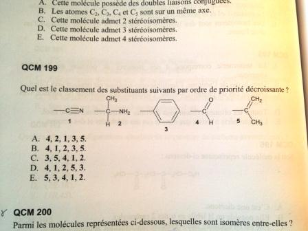 Alice Posted January 6, 2015 Posted January 6, 2015 Bonjour, Dans un QCM du livre de la prof ci-dessous en photo, je ne comprends pas pourquoi la réponse est B... Par exemple, la molécule 5 est dernière dans la classification donc aurait la priorité la moins importante. Or, en "cassant" la double liaison pour faire comme s'il y avait deux liaisons simples, le carbone se retrouve lié à 3 autres carbones; donc elle aurait la priorité sur la molécule 4 par exemple... Ou alors il ne faut pas faire ça ? Pourriez-vous m'indiquer où est-ce que je trompe ? Merci de votre aide !