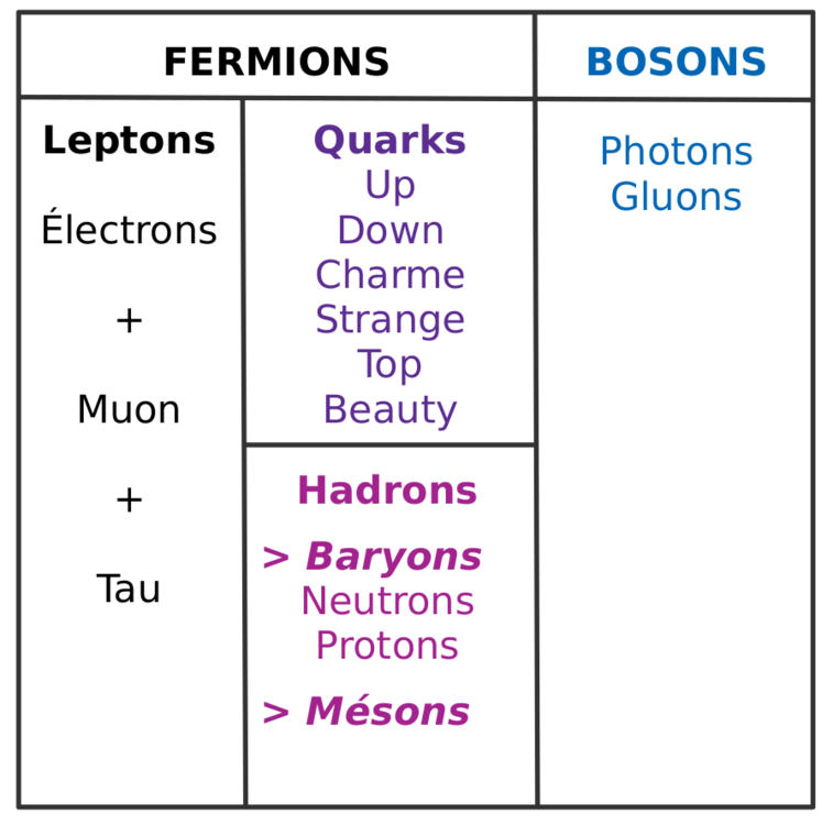 jenifervalette Posted October 20, 2020 Posted October 20, 2020 Bonjour, je vois souvent écrit dans les QCM les mots lepton, quartz, gluon, fermions, boson, méson, hadron, mais je ne sais pas trop à quoi ça correspond y’en a certain qui sont dans mon cour mais pas tous ducoup j’aimerais bien savoir à quoi ça correspond et s’ils sont liés ou pas ? merci bonne journée Quote