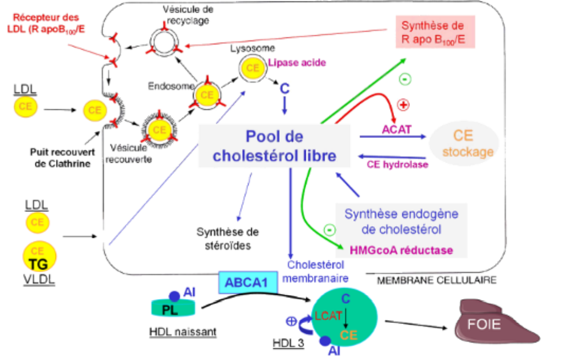 Solution Itinéris Posted October 31, 2020 Solution Posted October 31, 2020 Bonsoir bonsoiiiir ! Alors, la maladie de Wolman correspond à un déficit en lipase acide lysosomale. La lipase acide lysosomale agit à l'intérieur de la cellule. Elle dégrade les CE des LDL en cholestérol qui pourra agit via différentes voies : résumées dans ce joli schéma 1- l'ACAT tranforme le Cholestérol en CE de stockage, qui sera plus tard utilisé. 2- Le cholestérol inhibe la synthèse de Recepteur ApoB100/E. En effet, quand sa concentration intracellulaire augmente, elle diminue la fixation et donc l'nternalisation de nouveaux LDL et donc de nouveau cholestérol ! Logique !! 3- Elle inhibe la synthèse endogène de cholestérol via la HMGCoa réductase. Et oui, no need more CHolestérol, yen a déjà trop ! 4- Enfin, il va venir se fixer à la membrane et former du cholestérol membranaire, qui rentrera ensuite dans les HDL naissant grâce à ABCA1. Alors LCAT (activée par ApoA1) tranformera ce Cholestérol internalisé en CE, etc etc. Maintenant qu'on a compris tout ça, regardons ce qu'il se passe quand on a un déficit en lipase acide. A- C'est faux ! Pas de Cholestérol, pas besoin de le stocker ! L'activité de ACAT est fortement diminuée -> cf rappel 1- B- C'est vrai ! Moins de Cholestérol à l'intérieur, donc inhibition de l'inhibition de la formation de RApoB100/E donc augmentation du nombre de récepteur à la membrane !! -> cf rappel 2- C- Attention au piège, l'accumulation de CE est bien vrai, but non dans le cytosol, mais dans les lysosomes !! Ne tombe pas dans le piège ! Il est faux. D- C'est vrai ! Lors de leur internalisation dans la cellule puis dans les lysosomes, les LDL sont remplis de CE, mais aussi de TAG. Eux non plus ne seront aps pris en charge par la lipase acide puisqu'elle est déficiente. Ils s'accumuleront ! E- D'après le deuxième point, en diminuant le cholestérol intracellulaire, on augmente le nombre de récepteurs ApoB100/E à la membrane, donc les cellules captent davantage le LDL ! C'est faux. Est-ce que c'est mieux pour toi ? Hésite pas s'il reste des points d'ombre Quote