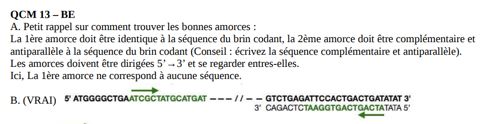 Solution adrénalex Posted November 24, 2020 Solution Posted November 24, 2020 Salut! Dans ce genre d’item on te donne uniquement le brin sens, mais quand tu veux amplifier une séquence il te faut le brin sens et le non sens car on utilise 2 amorces qui encadre la séquence que tu cherches à amplifier, une sur le brin sens et une sur le non sens. Chaque amorces doivent être complémentaire et anti parallèle de la séquence sur laquelle elles s’hybrident. Autrement dit les amorces doivent s’hybrider dans cette configuration là: Dans le QCM on te demande de chercher les séquences des amorces (flèches noires sur les schémas ci-dessus) en fonction de la séquence du brin sens. Donc tu vois que l’amorce du bas doit être complémentaire et anti-parallèle au brin non sens, et si elle est complémentaire et anti-parallèle du brin non sens c’est qu’elle identique à la séquence du brin sens. C’est pour ça qu’on te dit que la 1ère amorce doit être identique à la séquence du brin codant. Pour l’amorce du haut, elle doit être complémentaire et anti-parallèle au brin sens cette fois-ci, donc pour trouver cette amorce il te suffit d’écrire la séquence complémentaire et anti-parallèle du brins sens (qu’on te donne dans l’énoncé) et retrouver la séquence de la seconde amorce dans ce que t’as écrit. Attention pour la 2ème amorce faut que la séquence soit lu de 5' en 3', donc il faut que tu lises de droite à gauche si tu écris ta séquence directement en dessous du brin codant qu'on te donne dans l'énoncé. J’espère que j’ai été claire, n’hésite pas si il y a quelque chose que tu n’as pas compris! Quote