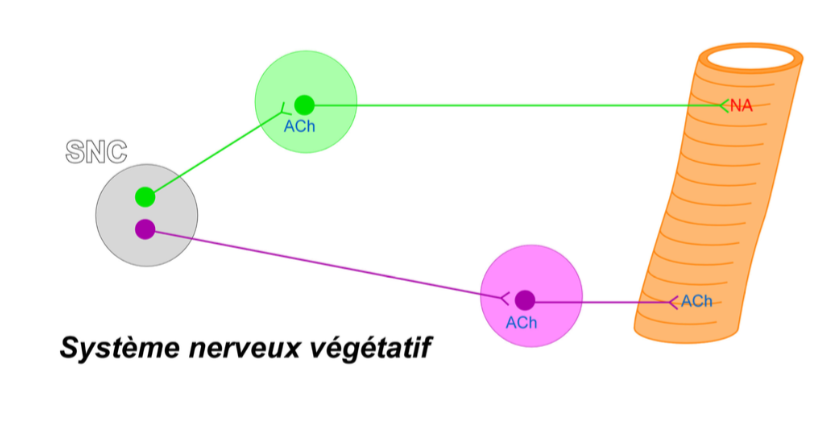 Ancien Responsable Matière Solution LAmi_Omelette Posted November 26, 2020 Ancien Responsable Matière Solution Posted November 26, 2020 Le 26/11/2020 à 14:17, oceane07 a dit : Bonjour, je suis vraiment désoler de vous déranger mais c'est le bordel dans ma tête... Salut ! Alors non jamais tu ne dérangeras ici Le 26/11/2020 à 14:17, oceane07 a dit : Au fur et à mesure des cours je m'embrouille entre tous les systèmes nerveux: Système cérébro-spinal, végétatif, autonome, somatique, périphérique... j'y vois flou rien qu'en écrivant !! Alors on va faire dans l'ordre : Système cérébro-spinal : est la partie du système nerveux comprenant l'encéphale et la moelle spinale, c'est conscient. L'être humain est en permanence en relation avec l'extérieur et doit pouvoir répondre de manière consciente afin de pouvoir vivre/sentir/écouter... Tu as dons un SNP et un SNC dans ce même SN cérébro-spinal, avec des récepteurs, fibres, noyaux gris et autres spécifiques de ce contingent. L'information sensitive une fois consciente (cortex cérébral) va entrainer une réponse motrice consciente (somatique) au niveau des FMSS (Fibres Musculaires Striées Squelettiques). Au niveau Anatomo-Descriptionnel maintenant ; Le Système Cérébro-Spinal est une voie efférente simple. Elle est constituée d’un seul neurone qui chemine du système nerveux central à l’effecteur (muscle). Système Nerveux Végétatif : contrôle les viscères, glandes, coeur (etc) de manière inconsciente, Autonome. Tu comprends bien que les récepteurs et les fibres de la voie organo-végétative seront différents de ceux de la voie cérébro-spinale consciente. Donc dans cette voie, tu auras un SNP différent (sur la fonction) et un SNC différent (sur la fonction) de la voie cérébro-spinale, puisque l'information sensitive ne va pas remonter au niveau cortical et va entraîner une réponse motrice végétative, ou autonome, qui sera ortho ou parasympathique. Tu as donc: - Un système nerveux central/périphérique pour l’environnement --> cérébro-spinal - Un système nerveux central/périphérique pour les viscères --> organo-végétatif Dans le Système Nerveux végétatif on retrouve deux composantes distinctes par le rôle et l'anatomie ; Les deux suivent un schéma générale d'anatomie; ils ont au niveau de la voie efférente un relais qui se fait au niveau de deux ganglions. Le Sytème Nerveux - Ortho-Sympathique : Les fonctions du système nerveux sympathique permettent, d'une façon simplifiée, de préparer le corps humain à l'action, de faire face à une situation de stress. Anatomiquement le ganglion Ortho-Sympatique est proche du SNC et loin de l'effecteur. Le neurone Pré-Ganglionnaire est donc court, myélinisé et utilise l'Acéthylcholine en neuromédiateur. Le neurone Post-Ganglionnaire est donc long, Amyélinisé et utilise la Noradrénaline en neuromédiateur. (En vert ici) Le neuromédiateur final (la Na) est un neuromédiateur des cathécolamines, au même titre que l'adrénaline ou dopamine, donc excitateur. Le ganglion relais sympathique peut se trouver : Sur le côté de la colonne vertébrale, on parle de ganglion paravertébral. En avant de la colonne vertébrale, on parle de ganglion prévertébral. Le neurone préganglionnaire fait relais dans le ganglion paravertébral. Ainsi, le neurone efférent dans la racine antérieure dessine un rameau communiquant blanc puis fait un relais avec le neurone postsynaptique dans le ganglion paravertébral. Ensuite, le neurone postganglionnaire va revenir le nerf spinal en formant un rameau communiquant gris puisque le neurone postganglionnaire n’est pas myélinisé. Système Nerveux Para-Sympathique : Ses actions sont généralement antagonistes à l'Ortho-Sympatique, il va s'occuper de ralentir le rythme cardiaque là où l'autre l'accélère par exemple. Anatomiquement le ganglion Ortho-Sympatique est loin du SNC et loin de l'effecteur. Le neurone Pré-Ganglionnaire est donc long, myélinisé et utilise l'Acéthylcholine en neuromédiateur. Le neurone Post-Ganglionnaire est donc court, Amyélinisé et utilise la l'Acéthylcholine en neuromédiateur. (En violet ici) Le neuromédiateur final (l'acte) est un neuromédiateur de "l'inhibition". Les neurones préganglionnaires parasympathiques sont : Dans le tronc cérébral, il s’agit du système parasympathique crânien. Dans la moelle épinière au niveau des myélomères sacrés S2 à S4, il s’agit du système parasympathique sacré. Ces deux système parasympathique s'occupent du corps entier, le crânien s'arrêtant au petit bassin supérieur. Les neurones préganglionnaires parasympathiques font relais avec les neurones postganglionnaires dans les ganglions préviscéraux (proches des viscères). Le Système Parasympathique Cranien : - Le ganglion otique permet la sécrétion salivaire de la glande parotide dépendante du nerf glosso-pharyngien. - Le ganglion ciliaire, satellite du nerf oculomoteur, ordonne la diminution du diamètre de la pupille (myosis). - Le ganglion ptérygo-palatin, qui permet la sécrétion lacrymale et nasale avec le nerf intermédiaire. - Le ganglion submandibulaire permet la sécrétion salivaire avec le nerf intermédiaire. Le nerf intermédiaire permet la sécrétion de toute les glandes sauf la parotide. Le nerf vague va permettre l’innervation parasympathique de l’ensemble des viscères thoraciques et abdominaux. Il va permettre par exemple : - Le ralentissement du rythme cardiaque (bradycardie). - La diminution de la fréquence respiratoire (bradypnée). - La digestion des aliments. Système parasympathique sacré : Le système parasympathique sacré va permettre l’innervation parasympathique de l’ensemble des organes pelviens. J'espère que j'ai pu t'aider. Calimera, DrFail, exosquelette and 7 others 2 6 2 Quote