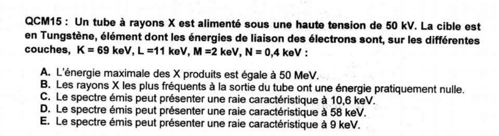 Solution marie570 Posted December 2, 2020 Solution Posted December 2, 2020 Salut @juliette5 !!! Pour résoudre ce QCM il faut que tu te fasses un schéma avec les différentes excitations et désexcitations que peuvent faire les électrons du Tungstène, c'est super simple à faire et ça permet de pas se tromper. Je t'ai fait le schéma du QCM. Avec une énergie de 50 keV, les électrons de la couche K ne pourront pas être excités car leur énergie est trop grande par rapport à l'énergie incidente. Par contre les électrons des couches L, M et N pourront être excités, c'est à dire passer à un état d'excitation supérieur(couche L à M ou M à N) et l'énergie émise correspond à la différence des énergie de liaison des couches dont il part et sur laquelle il arrive. A : Faux, c'est 50 keV pas des MeV B : Faux, leur énergie sera très grande vu qu'on a éliminé la plupart des photons X de faibles énergies avec les filtres C : Vrai, en se désexcitant, c'est à dire en revenant à l'état fondamental, le tungstène peut émettre un rayonnement de 10,6 keV en passant de la couche N à la couche L D : Faux, l'énergie de la couche K est trop grande E : Vrai, en se désexcitant, c'est à dire en revenant à l'état fondamental, le tungstène peut émettre un rayonnement de 9 keV en passant de la couche M à la couche L Voilà , j'espère avoir pu t'aider !!! N'hésites pas si tu as d'autres questions Bon courage Quote