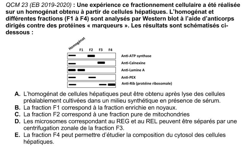 Rita Posted December 2, 2020 Posted December 2, 2020 (edited) Il y a 3 heures, exosquelette a dit : salut ! concernant le TD puisqu'on n'a pas eu le temps de traiter les dernières questions j'ai 2 petits problèmes : pour la D (VRAI) : comment sait-on que dans F3 du REL est présent ? pour moi dans cette fraction il n'y a pas de marqueur du REL qui est présent et donc dans la centrifugation zonale on ne sait pas si des microsomes corrrespondant au REL pourront être mis en évidence ! Salut ! @exosquelette La calnexine et la calréticuline sont deux proté chaperonnes contrôlant la qualité des proté formées et ces dernière sont bien marqueurs de RE ! en effet, ces dernières exercent leur job dans la lumière de RE ! pour ta 2ème question : Ta proté citée la lamine B est nucléaire ou plus précisément attachée à la membrane nucléaire par son ancre pényle, et dans sa structure on a la séquence NLS ! l'item te dit la forme sauvage de cette proté du coup sans adressage et sans tout la proté est nucléaire grâce à son NLS et interagit non pas avec GTPase Ran GDP mais putôt avec GTPase Ran GTP ! C'est plus clair pour toi ! Edited December 2, 2020 by Rita Quote