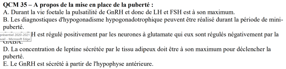 Solution Diosmectite Posted December 3, 2020 Solution Posted December 3, 2020 Salut @Hiboux A première vue je dirai comme toi. La concentration de Leptine doit être assez haute pour déclencher la puberté. Le truc c’est qu’il me semble qu’un taux de leptine trop haut comme dans le cas d’obésité morbide entraine une concentration en leptine faible (me demande pas pourquoi) et donc une inhibition du déclenchement de la puberté (schéma a l’appui si jamais). Donc pour moi cet item est bien faux mais pas pour la raison dit dans la correction ça je te l’accorde. Pour moi une concentration « maximale » c’est pas bon mais je suis peut-être un peut trop pointilleux. En espérant que ça t’aide quand même. Très bonne soirée et courage. Quote