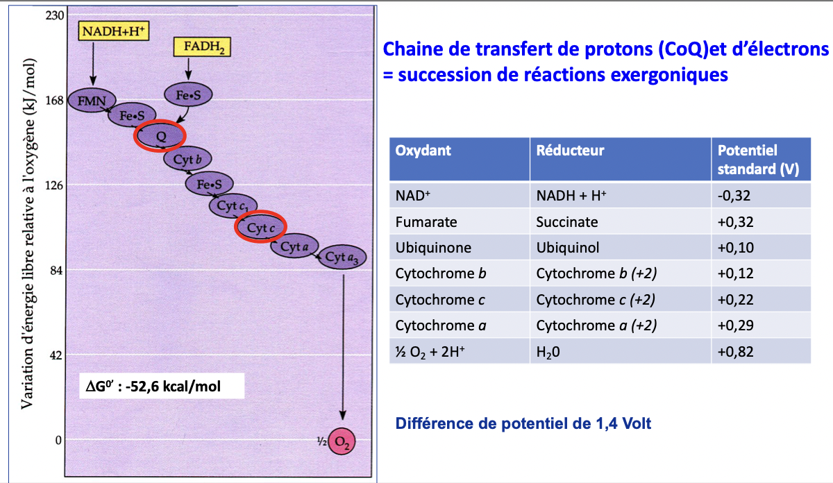 Solution Julyse Posted December 5, 2020 Solution Posted December 5, 2020 Salut @emma22 ! La variation d'enthalpie libre correspond à la variation d'énergie libre (là, en biomol parce que le prof a parlé de l'énergie mais je ne sais pas du tout si c'est vrai pour la chimie). Tu as le schéma à la diapo 33 du cours qui montre bien que la variation d'énergie libre baisse au cours de la chaine respiratoire. Là, on te demande de comparer le complexe I et le complexe II. COmme on a le complexe I avant le complexe II, je dirais que enthalpie libre complexe I > enthalpie libre complexe II. Bon courage ! inchallahjePASS 1 Quote