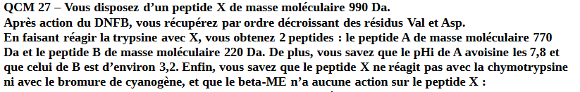 Ancien Responsable MatiĂšre SoFosBuVir Posted December 8, 2020 Ancien Responsable MatiĂšre Posted December 8, 2020 Salut @stabiloboss! JâespĂšre que tu vas bien !  Alors câest vrai que mĂȘme en relisant lâĂ©noncĂ© plusieurs fois cette phrase est un peu ambiguĂ«, je suis dâaccord avec @Julyse en effet il nây aura pas ce genre de doute aux partiels, moi je fais lâhypothĂšse suivante : notre peptide dâintĂ©rĂȘt commence par Val-Asp-X. On rĂ©cupĂ©rerait peut ĂȘtre dâabord le 1er AA puis le 2nd du peptide en partant de lâextrĂ©mitĂ© N-terminale car je ne vois pas trop dâautres explications. Cette rĂ©ponse nâengage que moi !  VoilĂ jâespĂšre que câest un peu plus clair.  Bon courage pour cette derniĂšre journĂ©e et surtout pour les 2 jours qui arrivent ! Donnes tout et apres profite de tes vacances.  Force et honneur Quote