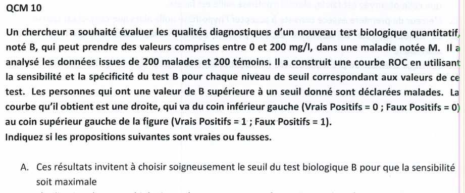Lemillion Posted December 31, 2020 Author Posted December 31, 2020 (edited) @Chat_du_Cheshire dsl dernière ptit question l'item est compté faux mais je ne comprends pas pourquoi on obtient une droite verticale donc la sp est tjr maximale mais on peut en faisant varier le seuil rendre la sensibilité maximale non ? + pourquoi ça apporte aucune info sur la présence ou l'abscence de la maladie ? une dernière pour qui veut ahaha pourquoi est-ce faux ? Edited December 31, 2020 by Lemillion Quote