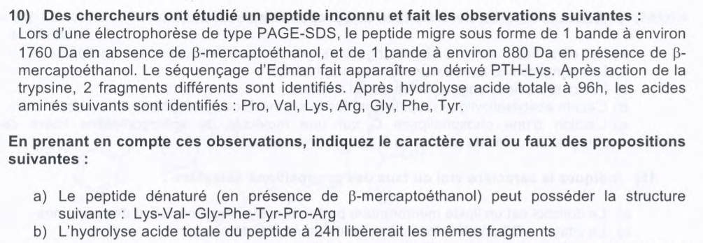 Ancien Responsable Matière Solution Pastel Posted January 3, 2021 Ancien Responsable Matière Solution Posted January 3, 2021 Salut @Lemillion ! Tu sais qu'avec B-mercaptonéthanol tu as 1 bande de 880 alors que sans tu en as 1 de 1760 --> il y a un pont SS dans ton peptide et tes deux chaines sont identiques vu qu'elles migrent toutes les 2 à 880. Après électrophorèse tu as 7 AA différents, donc il y en a qu'un par chaîne qui a disparu, et c'est forcément un cys vu que sans tu n'aurais pas pu avoir de pont SS ! Quote