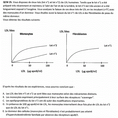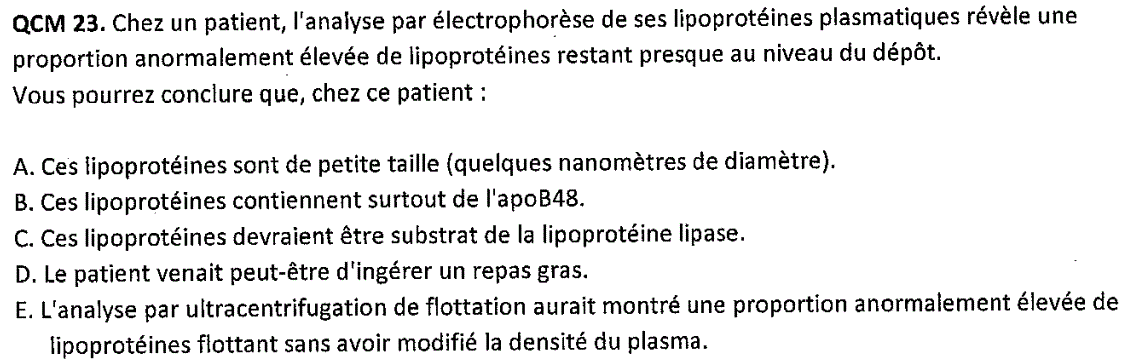 Solution StabiloT Posted January 5, 2021 Solution Posted January 5, 2021 il y a 20 minutes, futuredentiste a dit : Hello Ce QCM me pose problème les bonnes réponses sont: BCDE ici on parle bien des chylomicrons, ce que je ne comprends pas c'est que l'item E soi compté VRAI comment comprendre cet item ? de plus, il y a ce qcm qui m'embête les bonnes réponses sont ABCE je ne saisis pas pourquoi l'item D est faux et pourquoi l'item E est vrai ... merci d'avance ! Bonjour, pour le QCM 23 on se trouve bien en présence de chylomicrons Pour identifier les lipoprotéines ont a 2 techniques différentes : l'ultracentrifugation et l'electrphorese. Dans l'electrophorèse l'ordre de migration est la suivante (en partant de l'origine) : chylomicrons (a l'origine), LDL, VLDL et pour finir HDL D'après l'énoncé on se trouve bien en présence de chylomicrons vu qu'on a un depot à l'origine Pour la question E on utilise l'ultracentrifugation, cette technique consiste à faire flotter les lipoprotéines sur la solution aqueuse (ex plasma avec densité = 1) La densité des chylomicrons est de 0,95 il se trouve donc proche de la surface et ne nécessite pas l'ajout de Kbr pour le faire flotter vu que sa densité est inférieur a celle du plasma. L'item E est donc vrai petitepharmacienne and El_Zorro 2 Quote