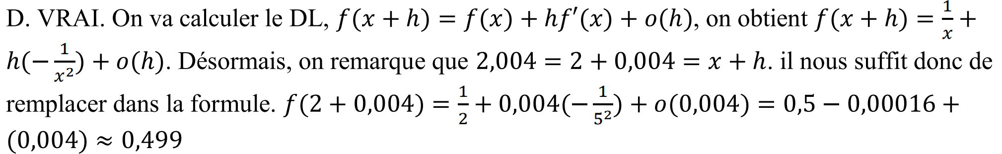 Oui, c'est bien ça; en négligeant o(h)=o(0,004), on a f(2,004) \approx 0,5-0,004*(1/2^2) = 0,5-0,004*(1/4) = 0,5-0,001 = 0,499 .