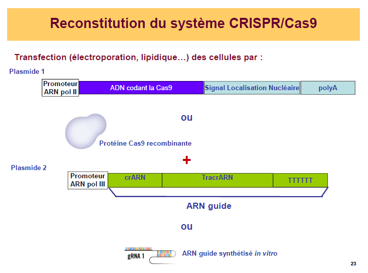 - une protéine Cas9, quelle soit déjà sous forme traduite, ou qui doit exprimer sous forme de plasmide