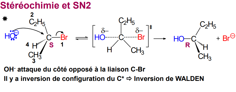 Solution Aspirateur_Tyron Posted March 11, 2021 Solution Posted March 11, 2021 (edited) Le 10/03/2021 à 18:53, Phagocytose a dit : Oui c'est ce que je demandais ^^ A chaque fois j'arrive pas a déterminer si c'est R/S, du coup je me demandais si ça avait été une trans addition (epoxydation) on aurait pu aussi obtenir 2R, 4R et 2S, 4R oui, dans le cas de la molécule que tu m'as montré dans l'exemple suivant Cela ne change rien au fait d'obtenir les même possibilités, soit R/S, car la cis/trans-addition s'effectuera sur la double liaison. Le 10/03/2021 à 18:53, Phagocytose a dit : ah je pensais du coup que si un composé était optique, c'était une élimination d'ordre 2 les éliminations se font selon des conditions spécifiques, mais le fait que le composé soit optique n'est pas quelque chose d'obligatoire: Dans ce cas là la molécule n'est pas optique car il y a 3 substituants qui sont les mêmes: le méthyl (CH3) Pour s'orienter donc vers une SN2, il faut se fier à ces caractéristiques, et/ou solvants utilisés pour la réaction: Lorsque dans l'énoncé on te parle de solvant polaire protique, et que c'est une substitution, ce sera forcément d'ordre 1, si c'est aprotique ce sera orientés vers l'ordre 2 Le 10/03/2021 à 18:53, Phagocytose a dit : Lorsqu'on fais une substitution Nucléophile d'ordre 2 nous avons pas de carbocation intermédiaire (différent d'un carbone asymétrique = C*). Il y a peu de chance, voir aucunes, qu'il y ait un mélange racémique au terme de cette réaction. Que ce soit la SN comme l'élimination, si elles sont d'ordre 2, elles auront un mécanisme concertés. Il y aura donc pas l'étape de Carbocation intermédiaire, il est juste là pour dire que c'est quelque chose qui s'effectue très rapidement: De plus, pour ce qui concerne les produits finaux de la réaction, ils seront donc très orienté, en prenant l'exemple du SN2, où on verra l'inversion de Walden: Même si toutefois il existe la rétention de configuration dans certains cas. Le 10/03/2021 à 18:53, Phagocytose a dit : du coup je comprends pas, on obtient un mélange racémique suite à une SN2 ? Pour terminer, une SN2 donne selon moi, une configuration qui est très orientée face à celle de départ, comme je te l'ai montré dans les diapos du cours, donc cela dépends selon moi si il y a une proportion équivalente de S ET de R au départ pour obtenir un mélange racémique, donc 50% de R et 50 % de S. Si il n'y a qu'un seul type de configuration dès le début, non. Il ne pourra y avoir qu'un seul type de configuration, suite au SN d'ordre 2. Le 10/03/2021 à 18:53, Phagocytose a dit : (désolée, je fais la reloue..) Absolument pas, ne t'excuse pas ! c'est peut-être moi qui me suis mal exprimé pour répondre à tes questions ! Edited March 11, 2021 by Aspirateur_Tyron Quote