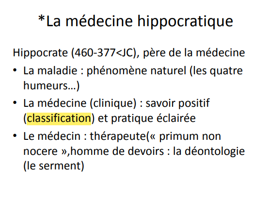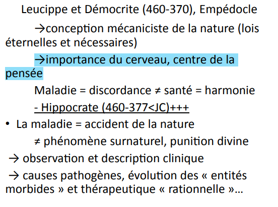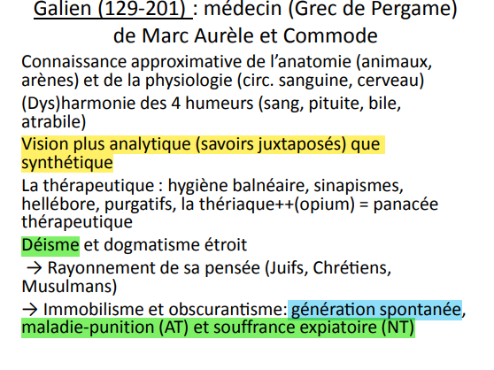 Ancien Responsable Matière Solution Bhan Posted March 20, 2021 Ancien Responsable Matière Solution Posted March 20, 2021 Coucou ! Allez je me lance pour la réponse à toutes ces questions Il y a 19 heures, chloefgn a dit : 1) Je ne comprends pas à quoi fait référence la notion de « classification » Tu comprends bien qu'à l'époque, la connaissance était loin d'être la même qu'aujourd'hui mais il y avait quand même des médecins et ils devaient bien se baser sur quelque chose de concret ! On utilisait donc une classification, qui appuie le savoir positif, et ça correspondait en gros à une utilisation d'une analyse logique des symptômes, basée sur la description clinique et l'observation, du coup on avait cette classification, dans l'idée d'une classification par exemples des espèces aujourd'hui mais pour à l'époque les pathologies ! Il y a 19 heures, chloefgn a dit : 2) Je ne comprends pas à quoi font référence ces dates par rapport à l’Inde. Est-ce que ce courant de pensée concernant les punitions divines n’a eu lieu qu’à cette époque ? Je trouve ça bizarre Je pense que c'est plutôt à partir de ce moment qu'est nait cette idée de punitions divines qui correspond à l'apparition des pathologies ! Et bien sur ce mouvement s'est répandu après, dans plusieurs religions ! Il y a 19 heures, chloefgn a dit : 3) La notion « d'âme psychique, sensible ou grossière » figure sur son diapo mais il n'en parle pas. Qu'est-ce que c'est ? Dans cette notion là, on considère qu'il y a une division de l'âme : -->L'âme psychique, la plus "logique" qui siège dans le cerveau -->L'âme sensible, celle qui se situe dans le cœur -->L'âme grossière, celle au niveau des tripes ! Et donc ces âmes correspondent à l'âme rationnelle (celle des hommes qui peuvent penser). Il y a 19 heures, chloefgn a dit : 4) Est-ce que la philosophie mécaniste fait donc référence à une importance du cerveau (il n’en parle pas en cours) ? Est-ce que c’est un lien entre l’existence de lois qui régissent le monde et le cerveau qui est le centre de la pensée ? Je t'avoue que j'ai pas la réponse ... Il y a 19 heures, chloefgn a dit : 5) « Vision plus analytique que synthétique » : est-ce que c’est pour dire qu’ils ne cherchent pas à aller plus loin que ce qu’ils observent ? On peut dire ça ! De manière générale, un mouvement synthétique va chercher à améliorer nos connaissances à l'inverse d'une vision analytique qui va chercher à rendre nos connaissances plus précises mais toujours sur des concepts que l'on connait déjà ! Il y a 19 heures, chloefgn a dit : 6) Étant donné que Galien est présenté comme l’héritier d’Hippocrate (qui lui même s’était en partie affranchie de la connotation religieuse), quand le prof parle de « Déisme, maladie punition, souffrance expiatoire » c’est parce que Galien a réintégré ces notions en plus de la médecine hippocratique non ? Je t'avoue que je n'ai pas la réponse non plus ! A mon avis, par le fait que son raisonnement était respecté et approuvé par de nombreuses religions et qu'il était lui même monothéiste, il devait y avoir dans son discours un fond de théologie ! Après ce n'est que mon propre avis, rien de concret et je peux me tromper ! Il y a 19 heures, chloefgn a dit : 7) Que veut-il dire par « génération spontanée » Après quelques recherches, j'ai trouvé la définition suivante pour la génération spontanée : "apparition sans ascendant, d’êtres vivants à partir de la matière inanimée". J'espère que mes réponses auront pu t'aider ! Et désolé de pas avoir répondu à toutes tes interrogations Bon courage et n'hésite pas si quelque chose n'est pas clair ! CUBEoïïïde 1 Quote