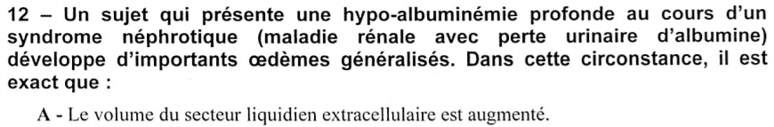 Lemillion Posted March 22, 2021 Author Posted March 22, 2021 il y a 10 minutes, PhosphatidylFlorine a dit : Alors pour moi vu que l'on perd de l'albumine lors d'un syndrome néphrotique, la pression oncotique diminue, des œdèmes vont apparaître dans le système interstitiel et puisqu'il y aura beaucoup moins de réabsorption on n'aura pas une élimination de l'eau hors de l'organisme donc au final on aura une augmentation du volume extracellulaire de par la formation de ces œdèmes. mais les oedèmes c'est un transfert de liquide plasmatique vers le milieu interstitiel donc comment ça peut faire varier le volume extra cellulaire ? il y a 11 minutes, PhosphatidylFlorine a dit : Personnellement ça ne me choque pas de parler de pic nocturne même si le pic d'ACTH à lieu en fin de nuit. Il me semble d'ailleurs que le prof le qualifie comme ça dans son cours. Je ne pense pas que le prof joue autant sur les détails dans ses QCM, si il avait voulu piéger sur le moment du pic il aurait fait un piège plus gros que ça. jvais rester sur ça ducoup ps: j'ai rajouté une question en deuspi, si t'as une idée te gène pas bg Quote