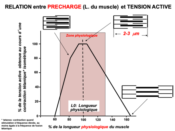 Solution Bonemine Posted April 21, 2021 Solution Posted April 21, 2021 (edited) Coucou @thuyx! Voici quelques explications en attendant la confirmation d'un RM/ tuteur, j'espère que ça t'aidera A. Faux. La vitesse de raccourcissement ne dépend pas de la précharge mais de la postcharge (plus la postcharge est lourde, plus la vitesse de raccourcissement est faible). B. C et D. La précharge détermine la longueur du muscle avant la contraction, c'est-à-dire le degré de chevauchement entre les filaments d'actine et de myosine. Cet état de chevauchement influe directement sur la tension active développée par le muscle lors d'une contraction isométrique. Le schéma ci-dessous permet d'évaluer la tension active obtenue au cours d'une contraction isométrique, en fonction de la longueur à laquelle la précharge amène le muscle (si on a ce schéma en tête, on peut répondre aux items B, C, et D) - Lorsque la précharge porte le muscle à sa longueur physiologique (100% en abscisse), correspondant à un chevauchement optimal entre les filaments d'actine et de myosine, le muscle développe son maximum de tension active: on parle de tension isométrique tétanique maximale. - Lorsque la précharge porte le muscle à moins de 70% (précharge faible => hyperchevauchement des filaments d'actine) ou plus de 130% (précharge élevée => désengrènement des filaments) de sa longueur physiologique, on sort de la zone physiologique et on assiste à une chute de la tension active. B. Faux. La tension développée avec la précharge PC1 ne peut pas correspondre à la tension tétanique maximale car PC1 amène le muscle à 65% de sa longueur physiologique. On se situe donc en dehors de la zone physiologique, on observe une chute de la tension active. C. Vrai. La précharge PC2 amène le muscle à 110% de sa longueur physiologique. On est donc bien proche de la longueur physiologique. D. Faux. Si le muscle est soumis à une précharge PC1 + PC2, le muscle est soumis à une précharge bien plus élevée, donc sa longueur est bien plus importante avant contraction. Cela équivaudrait à amener le muscle à plus de 170% de sa longueur physiologique (110 + 65). On voit sur le schéma qu'à une telle longueur, le désengrènement des filaments est tel que la tension active est nulle. Donc la tension active développée n'augmenterait pas si on cumulait les précharges, au contraire elle deviendrait quasiment nulle. E. Vrai. Une secousse musculaire est une réponse mécanique à un seul PA. Edited April 22, 2021 by Bonemine thuyx 1 Quote