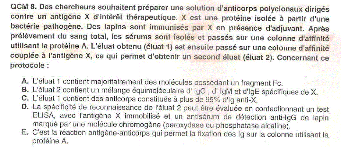 petitepharmacienne Posted April 28, 2021 Posted April 28, 2021 Salut! Dans ce qcm, je ne comprends pas comment (avec l'énoncé) on peut comprendre que l'éluat 1 contient majoritairement des IgG ( les bonnes réponses sont AD) et voici la correction si jamais ça peut aider à m'aider QCM 8 – AD A. Protéine A permet fixation de plusieurs isotypes d’anticorps (mais très majoritairement des IgG) : elle présente une forte affinité pour une séquence peptidique présente dans le domaine constant des chaînes Hg (c’est à dire dans le domaine Fc des chaînes Hg). B. L’éluat 2 contient bien un mélange d’Ig spécifiques de X mais pas équimolaires (car l’éluat 1 contenait très majoritairement des IgG). C. L’éluat 2 contient des anticorps constitués à plus de 95% d'Ig anti-X. E. La protéine A n’est pas un anticorps (elle fixe les fragments Fc des anticorps) : la réaction antigèneanticorps se fait quant à elle grâce au fragment Fab d’un anticorps. Quote