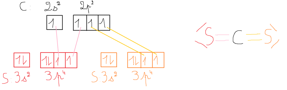 Ancien du Bureau Solution Amélithium Posted September 21, 2021 Ancien du Bureau Solution Posted September 21, 2021 On va commencer par le CS2 (c'est exactement pareil pour le CO2) : On cherche les couches externes et on dessine les OA avec les e- : Est-ce que tu es d'accord avec moi qu'on a ça ? Tu te doutes que l'atome central est celui qui est en 1 seul exemplaire donc le C. Ce C ne possède que 2 e- célib alors que les S à eux deux en ont 4. Tu sais que généralement une liaison c'est la mise en commun de 2 e- célib, chacun étant apporté par un atome de la liaison donc là tu vois que ça coince. Du coup tu vas exciter (= déplacer les e-) et hybrider (= faire que tu as des OA strictement identiques) ton atome de C (c'est tjrs le cas, je n'ai jamais vu de molécule où l'atome de C fait des liaisons dans son état fondamental). Et là tu obtiens 4 e- célib sur la couche externe du C et 4 sur les 2 S du coup tu peux tracer tes liaisons : Et dessiner ta molécule (en pensant à mettre les DNL). Tu vois que là ton C n'est lié qu'à 2 atomes et ne possède pas de DNL donc les 2 S vont s'éloigner le plus possible l'un de l'autre afin et donc la configuration dans l'espace où les atomes sont le plus éloignés c'est quand il y a un angle de 180° entre les 2. Donc tu vois que tes 3 atomes sont alignés. Est-ce que ça va pour cette molécule ? Concernant GaH3 tu suis exactement le même raisonnement. Ga : Z = 31 --> 4s² 4p1 Tu vois que Ga n'a qu'un seul e- célib donc tu excites afin de déplacer l'e- de la case 4s dans une des OA 2p pour avoir 3 e- célib et là tu peux dessiner tes liaisons et en déduire la géométrie de ta molécule ! Donc là tu as Ga qui est lié à 3 H et qui ne possède pas de DNL (seulement une OA vide mais ça ne prend pas de place donc ça ne rentre pas dans la géométrie de la molécule ! Du coup la répartition dans l'espace où les atomes sont le plus éloignés c'est le triangle plan (angle de 120° entre chaque H). Et du coup c'est bien plan là aussi et donc tous les atomes sont alignés ! Est-ce que tu comprends ? Si t'as des questions ou que je suis allée trop vite ou que tu ne comprends pas tout, n'hésite pas ! Révélation Je suis désolée, j'espère que vous arrivez à lire ce que j'ai écrit sur les images ... c'est pas super évident d'écrire sur l'ordi ... Si vous n'arrivez pas à me lire, dites me le ! Il y a 8 heures, ophebdt a dit : Mercii j’me suis rendue compte que y’avait pas mal de trucs que j’avais pas compris mais maintenant c’est bon, est ce du coup tous les atomes sont dans le même plan seulement quand la molécule est linéaire ou trigonale plane? Oui sauf quand tu as des DNL dans ce cas, comme pour H2O par exemple, les atomes seront alignés également ! omega3 1 Quote