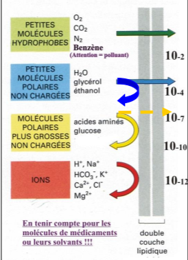 chloeee Posted November 21, 2021 Posted November 21, 2021 Bonsoir à toi, je vois que tu as aussi une question sur la différence entre diffusion simple ... donc je vais essayer de t'éclairer un peu ! diffusion simple : se fait spontanément, sans consommation d'énergie (ATP) ni protéine de transport. Cependant, toutes les molécules ne pourront pas utiliser la diffusion simple comme le montre ce schéma : (en haut les molécules diffusent très bien et plus on descend moins elles diffusent) Donc il y a la nécessité de mettre en place des mécanismes pour que les molécules en jaune ou en rouge sur le schéma puissent passer. L'un d'entre eux est l'utilisation des protéines de transport. Dès qu'on parle de transport on fait intervenir des agents protéiques qui aident les molécules à passer ; ces agents sont des transporteurs. Ainsi, le passage des molécules à travers la bicouche de lipide (la membrane), se fait grâce à des passages hydrophiles protéiques : canaux ou protéine de transport. transport passif = diffusion facilitée : il se fait donc grâce à un transporteur, dans le sens du gradient de concentration ou du gradient électrochimique de la molécule transportée -> pas de consommation d'énergie (ATP). Ce transport passif correspond à une accélération de la diffusion simple. Bonne soirée à toi Quote