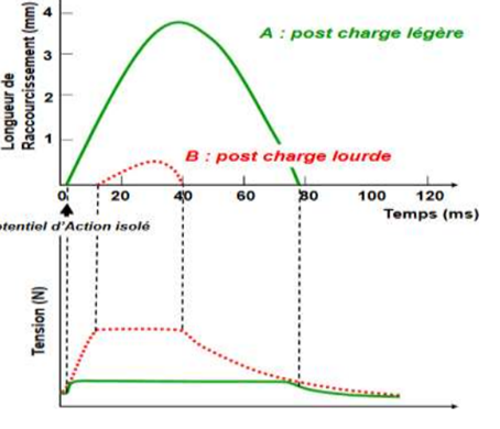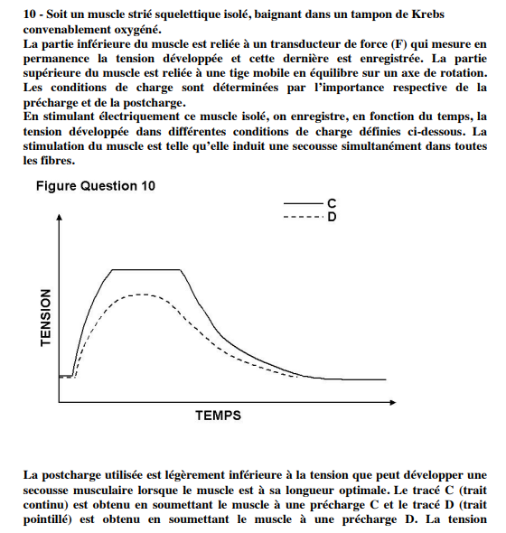 Ancien du Bureau Solution MauriceLePoisson Posted December 2, 2021 Ancien du Bureau Solution Posted December 2, 2021 Dacodac on va reprendre tout cela !! il y a 20 minutes, otarifampicine a dit : et ni à la deuxième puisque j'ai vu que : - lorsque la post-charge est légèrement inférieure à la tension max on est face à une contraction isotonique - et lorsque la post-charge est légèrement supérieure à la tension max on est face à une contraction isométrique mais du coup je ne comprends pas comment on peut avoir les 2 types de contraction différentes sur un même graphique alors qu'on est dans la condition 1 Si tu regardes bien ton graphique il ressemble "étrangement" à celui-ci de ton cours qui se place dans le cas d'une contraction isotonique. Cela est du au fait que tu as plusieurs PA qui te provoquent un plateau. Le tracé D lui ressemble plus à ce graphique qui lui caractérise une contraction isométrique De plus le fait de modifier la précharge est un phénomène expérimental qui se fait avant ton expérience donc il ne faut pas que tu le relies à des contractions isométriques ou isotoniques. Je vais enfin te rassurer en te disant que même si c'est le professeur qui a rédigé ces QCM, ces derniers ne tomberont pas de cette façon le jour de l'examen donc no panic On vous soutient à fond dans cette épreuve et toute la team physio est super fière de vous Quote