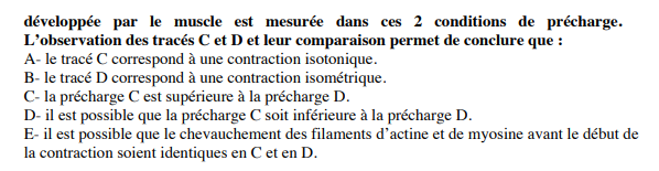 otarifampicine Posted December 2, 2021 Posted December 2, 2021 salutt, j'ai essayé de faire ce qcm mais je ne comprend pas trop la méthode à avoir pour répondre à ces items... on dit que la post-charge est légèrement inférieure à la tension max on devrait donc être face à une contraction isotonique mais alors pourquoi la B est vraie ? et comment interpréter les précharges avec le graph pour savoir si une est > à l'autre ou inversement ? mercii à celui/celle qui saura m'éclairer ! REPONSES : ABD Quote