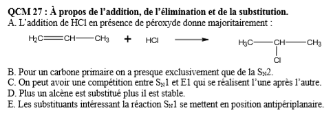 Chloe-M Posted October 23, 2015 Posted October 23, 2015 Bonjour, j'ai encore un soucis avec un QCM du poly ^^ Je mets le QCM en pièce jointe. L'item A est compté faux. Et la correction donnée est la suivante : Ce sera CH2Cl - CH2 - CH2I car I attire et CH3 repousse : mécanisme Anti Markownikov Ma question est.. D'où sort ce I? J'ai du mal à comprendre.. ^^ Merciiiii