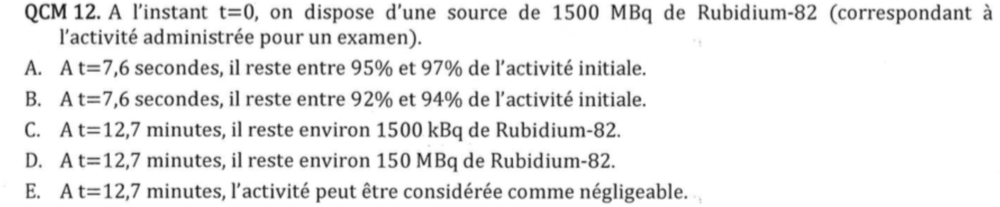 Ancien Responsable Matière Solution Le_Purpanais Posted December 10, 2021 Ancien Responsable Matière Solution Posted December 10, 2021 Alors la formule qu'il te faut utiliser ici est A(période) = A0 x e-ln(2) x (t/période) Pour les calculs, on nous demande l’activité du Rubidium-82 au bout de 7,6secondes en sachant que sa période est de 76 secondes : A(24h) = A0 x e-ln(2) x (t/période) = A0 x e-0,7 x (7,6/76) --> A 0 x e-0,7 x (1/10) = A0 x (1 - 0,7/10) = A0 x (1 - 0,07) = A0 x 0,93 --> Item B VRAI Ensuite, Il faut savoir qu'après dix périodes (10 x 76s = 760s = 12,7mins) l'activité devient négligeable --> item E VRAI Ça va mieux ? Iwiish and Maudm 1 1 Quote