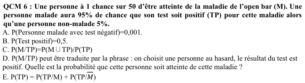 Membre d'Honneur Solution windu Posted December 11, 2021 Membre d'Honneur Solution Posted December 11, 2021 Coucou ! En prenant comme point de départ T+ = test positif et M+ = malade (et l'inverse avec les signes -) tu sais que tu cherches p(T+) sachant que tu as p(T+/M+) et p(T+/M-) dans l'énoncé qui sont respectivement de 0,95 et 0,05. Or p(T+) = p(M+). p(T+/M+) + p(M-).p(T+/M-) = 1/50 . 0,95 + 49/50 . 0,05 = 0,019 + 0,049 = 0,068. Donc on trouve bien la valeur de la correction ! Est-ce que c'est bon pour toi ? PASStèque and konis7 1 1 Quote