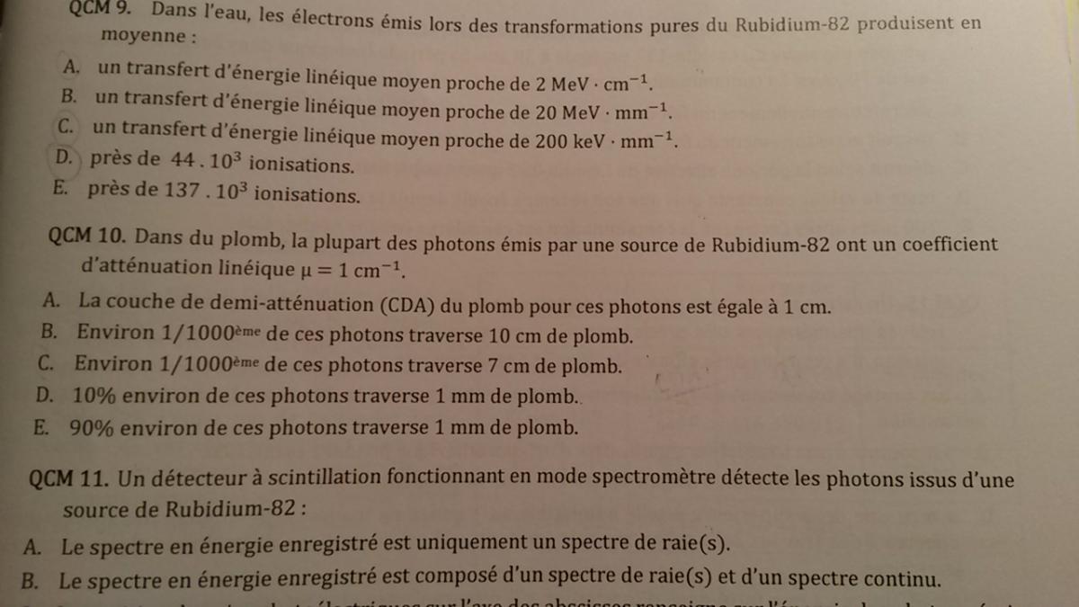 Solution AnneClaireT Posted November 8, 2015 Solution Posted November 8, 2015 Pour le qcm 10: A- CDA = 0.693/1 = environ 0.7 cm B et C- Tu remarques que 7 cm c'est 10CDA donc tu divises ton faisceau incident par 2^10 soit environ 1000 (exactement 1024) donc tu as bien 1/1000 photons qui traversent donc B faux et C vrai D et E- Nx=N0*exp(-μ *x) donc Nx/No= (1-1*0.1) =0.9 donc 90%