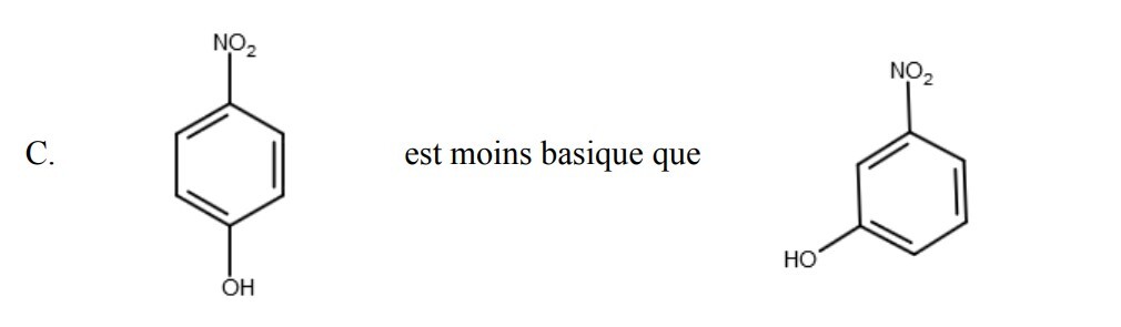 Solution captainsdaughter Posted January 19, 2022 Solution Posted January 19, 2022 En position ortho et para la forme phénolate ( déprotonée = acide ) du nitrophénol est stabilisée par conjugaison avec le NO2 tandis que la forme méta ne se conjugue qu'avec le cycle ( c'est assez compliqué à voir mais si tu dessines les formes mésomères pour le méta nitrophénolate tu verras que si tu respspecte la règle de l'octet tu pourras distribuer la charge - uniquement au cycle D'où le para est plus acide donc moins basique que le méta grrr 1 Quote